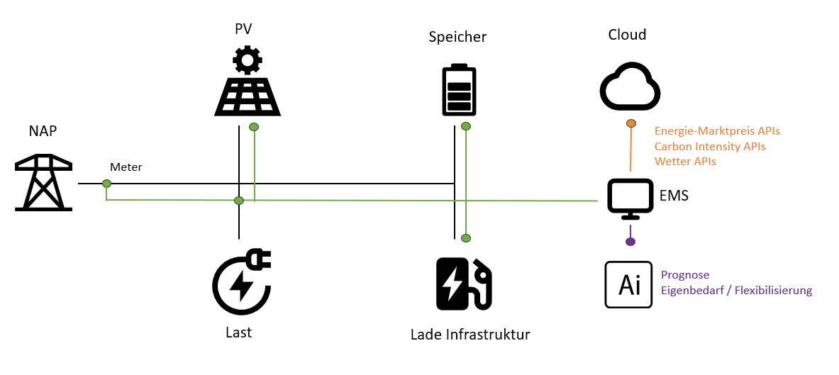 Die digitale Aussteuerung der Energieflüsse ist für Unternehmen die Grundlage für die effektive Nutzung von selbst erzeugter Energie, den marktoptimierten Bezug und die Flexibilisierung des Verbrauchs mit dem Ziel der Senkung der Betriebskosten. Das EMS steuert Speicher, PV-Generatoren, Blockheizkraftwerke und andere Generatoren sowie auch die lokalen Lasten und den Netzbezug aus. Neben der durch Normierung detailliert geregelten elektrischen Anbindungen der Komponenten bedarf das EMS auch einer Kommunikations-Infrastruktur, die resilient ausgelegt sein muss.